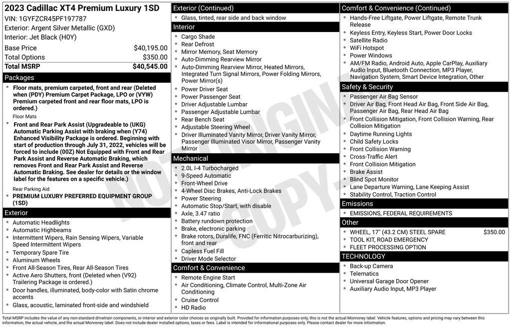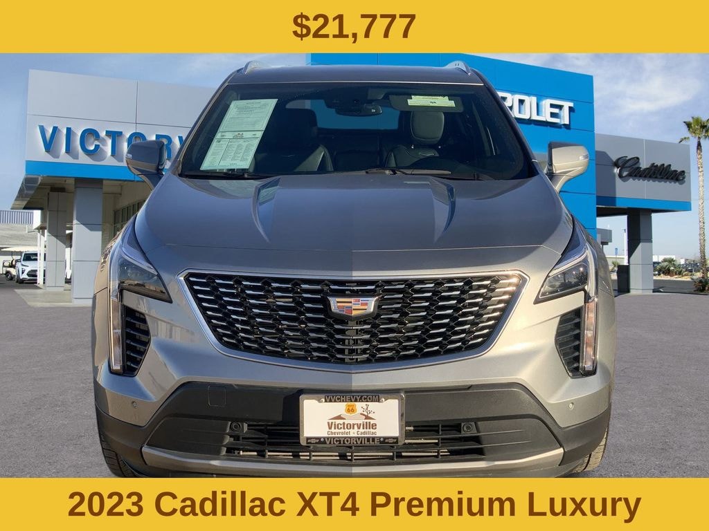Preferred Equipment Group 1SD (2-Way Driver Seat Power Lumbar Control, 2-Way Passenger Seat Power Lumbar Control, 4.2" Diagonal Color Display Driver Info Center, 6-Way Power Passenger Seat Adjuster, 7-Speaker Audio System w/Auxiliary Amplifier, Auto-Dimming Inside Rear-View Mirror, Automatic Emergency Braking, Electronic Cruise Control w/Set & Resume Speed, Front & Rear Park Assist, HD Rear Vision Camera, and Manual Rake & Telescoping Steering Column), XT4 Premium Luxury Certified, 4D Sport Utility, 2.0L I4 Turbocharged, 9-Speed Automatic, FWD, Argent Silver Metallic, Black Leather, 3.47 Axle Ratio, 4-Wheel Disc Brakes, 7 Speakers, 8-Way Power Driver Seat Adjuster, ABS brakes, Air Conditioning, Alloy wheels, AM/FM radio: SiriusXM with 360L, Apple CarPlay/Android Auto, Auto High-beam Headlights, Auto-dimming door mirrors, Auto-dimming Rear-View mirror, Automatic temperature control, Brake assist, Bumpers: body-color, Compass, Delay-off headlights, Driver door bin, Driver vanity mirror, Dual front impact airbags, Dual front side impact airbags, Electronic Stability Control, Emergency communication system: OnStar and Cadillac connected services capable, Four wheel independent suspension, Front anti-roll bar, Front Bucket Seats, Front Center Armrest, Front dual zone A/C, Front reading lights, Fully automatic headlights, Garage door transmitter, HD Radio, Heated door mirrors, Illuminated entry, Knee airbag, Leather Seating Surfaces, Leather steering wheel, Low tire pressure warning, Memory seat, Occupant sensing airbag, Outside temperature display, Overhead airbag, Overhead console, Panic alarm, Passenger door bin, Passenger vanity mirror, Power door mirrors, Power driver seat, Power Liftgate, Power passenger seat, Power steering, Power windows, Radio data system, Radio: Cadillac User Experience AM/FM Stereo, Rain sensing wipers, Rear anti-roll bar, Rear reading lights, Rear seat center armrest, Rear window defroster, Rear window wiper, Remote keyless entry, Road Emergency Tool Kit, Roof rack: rails only, Security system, SiriusXM w/360L, Speed control, Speed-sensing steering, Split folding rear seat, Spoiler, Standard Suspension, Steering wheel mounted audio controls, Tachometer, Telescoping steering wheel, Tilt steering wheel, Traction control, Trip computer, Turn signal indicator mirrors, Variably intermittent wipers, Voltmeter, Wheels: 18" 10-Spoke Pearl Nickel Finish Alloy, and Wireless Apple CarPlay/Wireless Android Auto.