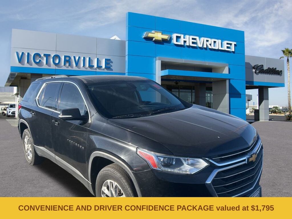 Convenience & Driver Confidence Package (4.2" Multi-Color Enhanced Driver Instrument Display, Heated Driver & Front Passenger Seats, Lane Change Alert w/Side Blind Zone Alert, Radio: Chevrolet Infotainment AM/FM w/8" Screen, Rear Cross Traffic Alert, Rear Park Assist w/Audible Warning, Rear Power Liftgate, Remote Start, SiriusXM Radio, and Universal Home Remote), Front License Plate Bracket Mounting Package, Preferred Equipment Group 1LT, Traverse LT Cloth w/1LT, 4D Sport Utility, 3.6L V6 SIDI VVT, 9-Speed Automatic, FWD, Mosaic Black Metallic, Jet Black Cloth, 3.49 Axle Ratio, 3rd row seats: split-bench, 4-Wheel Disc Brakes, 6 Speakers, 7-Passenger Seating (2-2-3 Seating Configuration), ABS brakes, Air Conditioning, Alloy wheels, AM/FM radio: SiriusXM, Apple CarPlay/Android Auto, Automatic temperature control, Brake assist, Bumpers: body-color, Compass, Delay-off headlights, Driver door bin, Driver vanity mirror, Dual front impact airbags, Dual front side impact airbags, Electronic Stability Control, Emergency communication system, Four wheel independent suspension, Front anti-roll bar, Front Bucket Seats, Front Center Armrest, Front dual zone A/C, Front fog lights, Front reading lights, Fully automatic headlights, Heated door mirrors, High-Intensity Discharge Headlights, Illuminated entry, Low tire pressure warning, Occupant sensing airbag, Outside temperature display, Overhead airbag, Overhead console, Panic alarm, Passenger door bin, Passenger vanity mirror, Power door mirrors, Power driver seat, Power steering, Power windows, Premium Cloth Seat Trim, Radio data system, Radio: Chevrolet Infotainment System AM/FM Stereo, Rear air conditioning, Rear anti-roll bar, Rear reading lights, Rear window defroster, Rear window wiper, Remote keyless entry, Roof rack: rails only, Security system, Speed control, Speed-sensing steering, Spoiler, Steering wheel mounted audio controls, Tachometer, Telescoping steering wheel, Tilt steering wheel, Traction control, Trip computer, Turn signal indicator mirrors, Variably intermittent wipers, Voltmeter, and Wheels: 18" Bright Silver Painted Aluminum.