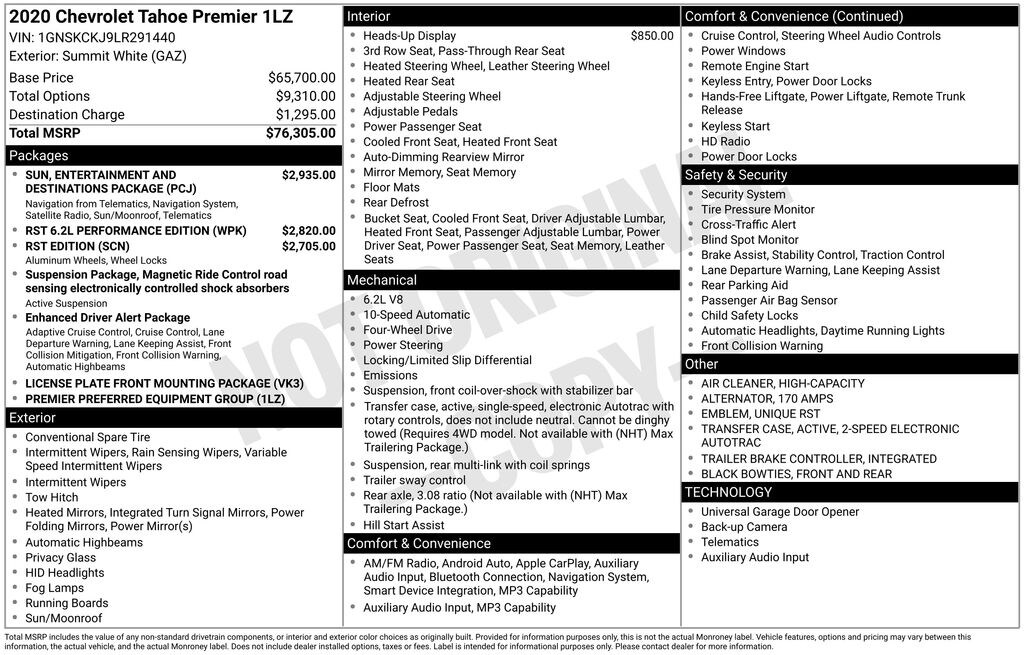 Summit White 2020 Chevrolet Tahoe Premier 4WD 10-Speed Automatic with Overdrive EcoTec3 6.2L V8 Tahoe Premier, 4D Sport Utility, EcoTec3 6.2L V8, 10-Speed Automatic with Overdrive, 4WD, Summit White, Jet Black Leather.
