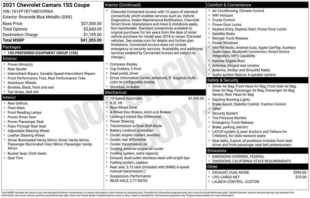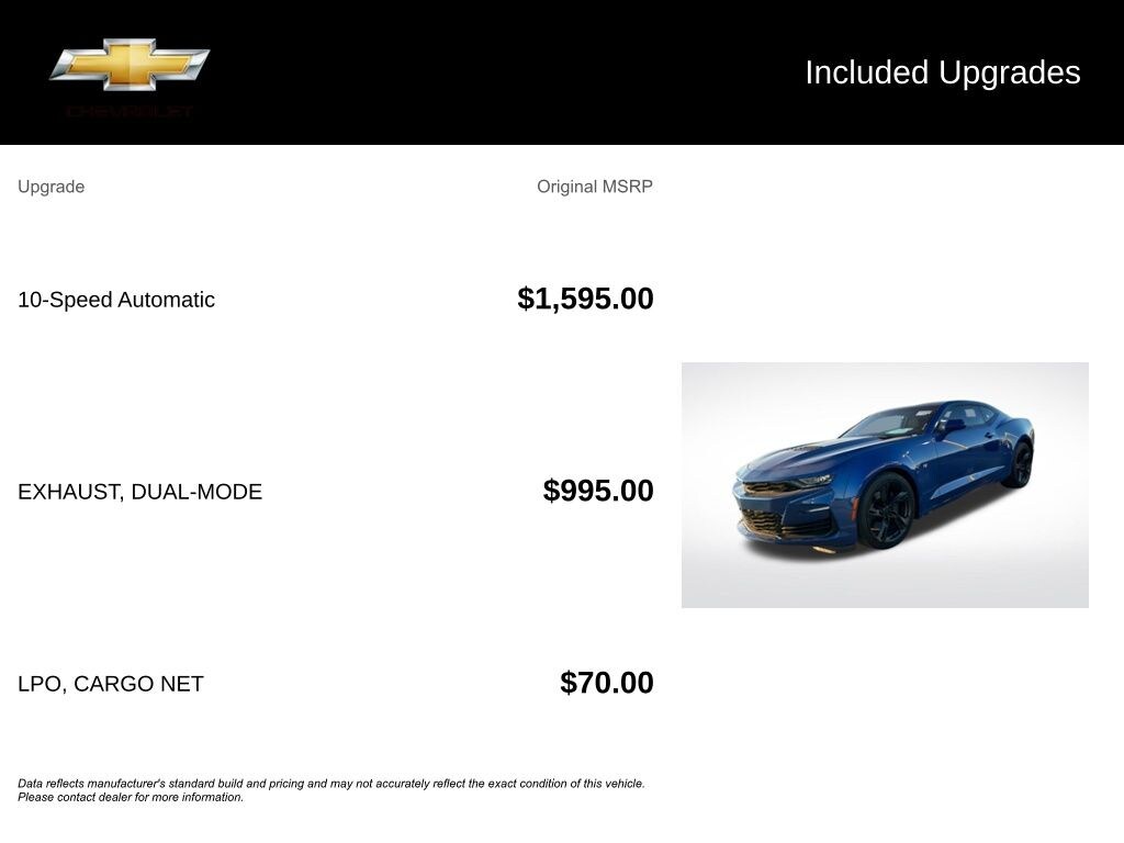 Camaro SS 1SS, 2D Coupe, 6.2L V8, 10-Speed Automatic, RWD, Riverside Blue Metallic, Jet Black Cloth, 2.77 Rear Axle Ratio, 4-Wheel Disc Brakes, 6 Speakers, 6-Speaker Audio System Feature, 6-Way Power Front Passenger Seat Adjuster, 8-Way Power Driver Seat Adjuster, ABS brakes, Air Conditioning, Alloy wheels, Apple CarPlay/Android Auto, Automatic temperature control, Bluetooth® For Phone, Brake assist, Bumpers: body-color, Cargo Net, Cloth Seat Trim, Compass, Delay-off headlights, Driver door bin, Driver vanity mirror, Dual front impact airbags, Dual front side impact airbags, Dual Mode Exhaust, Electronic Stability Control, Exterior Parking Camera Rear, Four wheel independent suspension, Front anti-roll bar, Front Bucket Seats, Front Center Armrest, Front reading lights, Front Sport Bucket Seats, Fully automatic headlights, Illuminated entry, Knee airbag, Leather Shift Knob, Low tire pressure warning, Occupant sensing airbag, Overhead airbag, Paddle-Shift Manual Controls, Panic alarm, Passenger door bin, Passenger vanity mirror, Power door mirrors, Power driver seat, Power passenger seat, Power steering, Power windows, Premium audio system: Chevrolet Infotainment System, Radio data system, Radio: Chevrolet Infotainment 3 Plus System, Rear anti-roll bar, Rear window defroster, Remote keyless entry, Remote Vehicle Starter System, Security system, SiriusXM w/360L, Speed control, Speed-sensing steering, Steering wheel mounted audio controls, Tachometer, Telescoping steering wheel, Tilt steering wheel, Traction control, Trip computer, Variably intermittent wipers, and Voltmeter.
