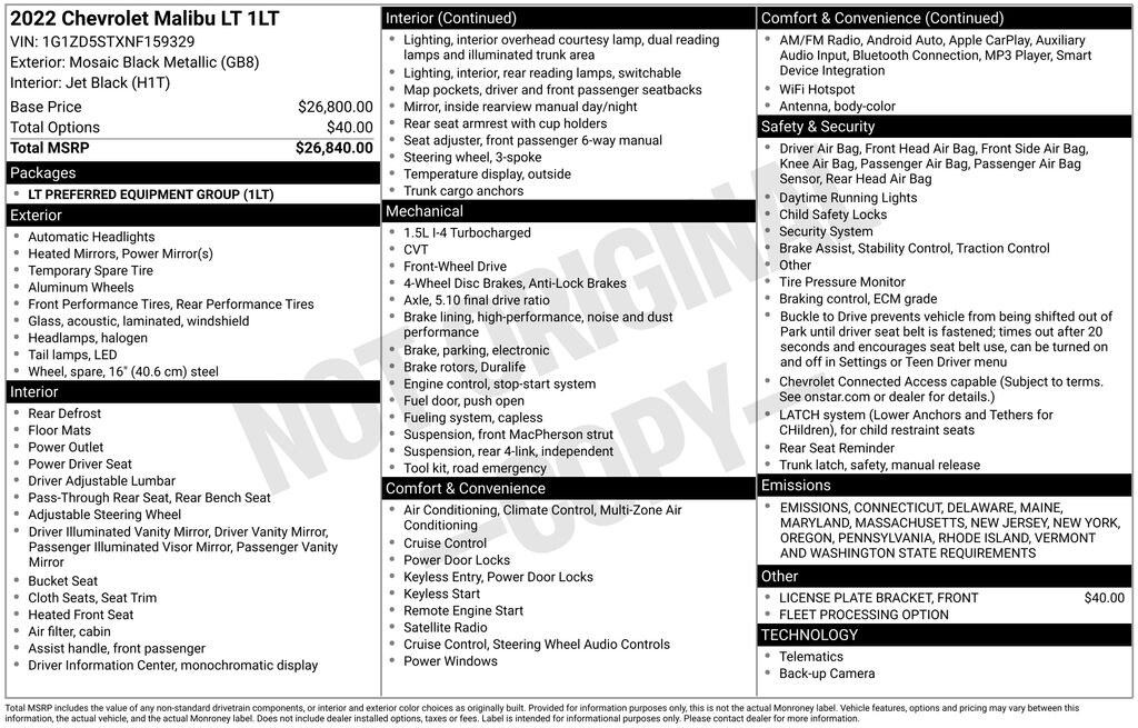 Preferred Equipment Group 1LT, Malibu LT, 4D Sedan, 1.5L DOHC, FWD, Mosaic Black Metallic, Black Cloth, 17" Aluminum Wheels, 4-Wheel Disc Brakes, 6 Speakers, 6-Speaker Audio System Feature, 6-Way Manual Front Passenger Seat Adjuster, 8-Way Power Driver Seat Adjuster, ABS brakes, Air Conditioning, Alloy wheels, AM/FM radio: SiriusXM, Automatic temperature control, Brake assist, Bumpers: body-color, Compass, Delay-off headlights, Driver door bin, Driver vanity mirror, Dual front impact airbags, Dual front side impact airbags, Electronic Stability Control, Emergency communication system: OnStar and Chevrolet connected services capable, Exterior Parking Camera Rear, Four wheel independent suspension, Front anti-roll bar, Front Bucket Seats, Front Center Armrest, Front dual zone A/C, Front License Plate Bracket, Front reading lights, Fully automatic headlights, Heated door mirrors, Heated front seats, Illuminated entry, Knee airbag, Low tire pressure warning, Occupant sensing airbag, Outside temperature display, Overhead airbag, Overhead console, Panic alarm, Passenger door bin, Passenger vanity mirror, Power door mirrors, Power Driver Lumbar Control Seat Adjuster, Power driver seat, Power steering, Power windows, Premium audio system: Chevrolet Infotainment 3 Plus, Premium Cloth Seat Trim, Radio data system, Radio: Chevrolet Infotainment 3 System, Rear anti-roll bar, Rear reading lights, Rear seat center armrest, Rear side impact airbag, Rear window defroster, Remote keyless entry, Security system, SiriusXM Radio, Speed control, Split folding rear seat, Steering wheel mounted audio controls, Tachometer, Telescoping steering wheel, Tilt steering wheel, Traction control, Trip computer, Variably intermittent wipers, Voltmeter, and Wireless Apple CarPlay/Android Auto.