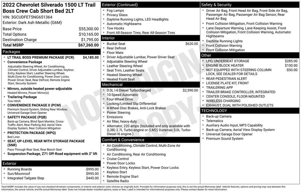 Dark Ash Metallic 2022 Chevrolet Silverado 1500 LT Trail Boss 4WD 10-Speed Automatic 3.0L I6 Silverado 1500 LT Trail Boss, 4D Crew Cab, 3.0L I6, 10-Speed Automatic, 4WD, Dark Ash Metallic, Black Leather.