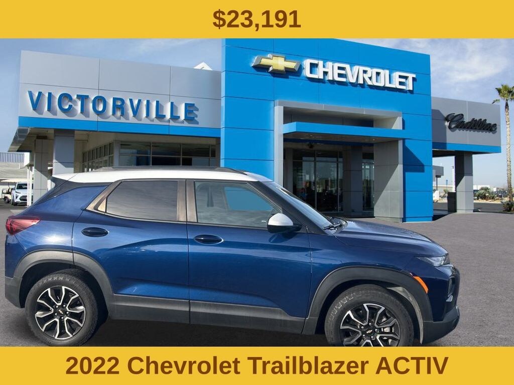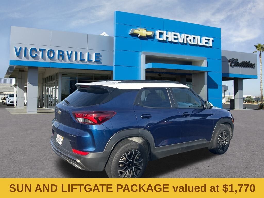 Convenience Package (1 Type-A & 1 Type-C USB Charging-Only Ports, 120-Volt Power Outlet, 8" Diagonal Color Touchscreen Display, Cabin Humidity Sensor, Driver & Front Passenger Illuminated Vanity Mirrors, Inside Rear-View Auto-Dimming Mirror, and Single-Zone Auto Climate Control Air Conditioning), Driver Confidence Package (Lane Change Alert w/Side Blind Zone Alert, Rear Cross Traffic Alert, and Rear Park Assist), Preferred Equipment Group 1SA (Heated Steering Wheel), Sun & Liftgate Package (Dual-Pane Panoramic Power Sunroof and Hands-Free Power Programmable Liftgate), TrailBlazer ACTIV, 4D Sport Utility, 1.3L Ecotec Turbo DOHC SIDI w/VVT, 9-Speed Automatic, AWD, Blue Glow Metallic, Jet Black With Arizona Accents Artificial Leather, 2-Way Power Driver Lumbar Seat Adjuster, 3.17 Axle Ratio, 4-Way Manual Front Passenger Seat Adjuster, 4-Wheel Disc Brakes, 6 Speakers, 6-Speaker Audio System Feature w/Amplifier, 8-Way Power Driver Seat Adjuster, ABS brakes, Air Conditioning, Alloy wheels, AM/FM radio: SiriusXM, Auto High-beam Headlights, Brake assist, Bumpers: body-color, Compass, Delay-off headlights, Driver door bin, Driver vanity mirror, Dual front impact airbags, Dual front side impact airbags, Electronic Stability Control, Emergency communication system: OnStar and Chevrolet connected services capable, Exterior Parking Camera Rear, Flat-Folding Front Passenger Seatback, Front anti-roll bar, Front Bucket Seats, Front Center Armrest, Front fog lights, Front License Plate Bracket, Front reading lights, Front wheel independent suspension, Fully automatic headlights, Heated door mirrors, Heated Driver & Front Passenger Seats, Heated front seats, Heated steering wheel, Illuminated entry, Knee airbag, Leather Shift Knob, Leather steering wheel, Leatherette Seat Trim, Low tire pressure warning, Occupant sensing airbag, Overhead airbag, Overhead console, Panic alarm, Passenger door bin, Passenger vanity mirror, Power door mirrors, Power driver seat, Power steering, Power windows, Radio data system, Radio: Chevrolet Infotainment 3 System, Rear seat center armrest, Rear side impact airbag, Rear window defroster, Rear window wiper, Remote keyless entry, Ride & Handling Suspension, Roof rack: rails only, Security system, SiriusXM Radio, Speed control, Split folding rear seat, Spoiler, Steering wheel mounted audio controls, Summit White Two-Tone Roof, Tachometer, Telescoping steering wheel, Tilt steering wheel, Traction control, Trip computer, Variably intermittent wipers, Wheels: 17" High Gloss Black Machined Aluminum, and Wireless Apple CarPlay/Android Auto.