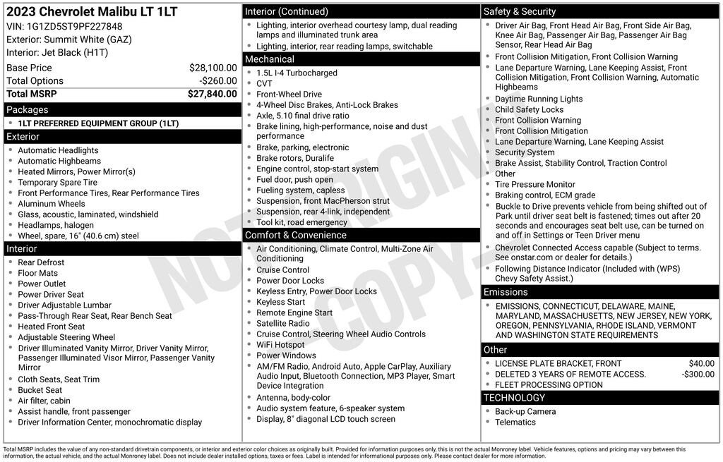 Preferred Equipment Group 1LT, Malibu LT 1LT, 4D Sedan, 1.5L DOHC, FWD, Summit White, Black Cloth, 17" Aluminum Wheels, 4-Wheel Disc Brakes, 6 Speakers, 6-Speaker Audio System Feature, 6-Way Manual Front Passenger Seat Adjuster, 8-Way Power Driver Seat Adjuster, ABS brakes, Air Conditioning, Alloy wheels, AM/FM radio: SiriusXM, Apple CarPlay/Android Auto, Auto High-beam Headlights, Automatic temperature control, Brake assist, Bumpers: body-color, Compass, Delay-off headlights, Deleted 3 Years of Remote Access, Driver door bin, Driver vanity mirror, Dual front impact airbags, Dual front side impact airbags, Electronic Stability Control, Emergency communication system: OnStar and Chevrolet connected services capable, Exterior Parking Camera Rear, Four wheel independent suspension, Front anti-roll bar, Front Bucket Seats, Front Center Armrest, Front dual zone A/C, Front License Plate Bracket, Front reading lights, Fully automatic headlights, Heated door mirrors, Heated Driver & Front Passenger Seats, Heated front seats, Illuminated entry, Knee airbag, Low tire pressure warning, Occupant sensing airbag, Outside temperature display, Overhead airbag, Overhead console, Panic alarm, Passenger door bin, Passenger vanity mirror, Power door mirrors, Power Driver Lumbar Control Seat Adjuster, Power driver seat, Power steering, Power windows, Premium audio system: Chevrolet Infotainment 3 Plus, Premium Cloth Seat Trim, Radio data system, Radio: Chevrolet Infotainment 3 System, Rear anti-roll bar, Rear reading lights, Rear seat center armrest, Rear side impact airbag, Rear window defroster, Remote keyless entry, Security system, SiriusXM Radio, Speed control, Split folding rear seat, Steering wheel mounted audio controls, Tachometer, Telescoping steering wheel, Tilt steering wheel, Traction control, Trip computer, Variably intermittent wipers, Voltmeter, and Wireless Apple CarPlay/Android Auto.