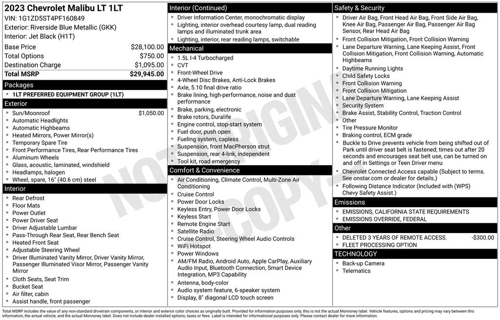 Preferred Equipment Group 1LT, Malibu LT 1LT, 4D Sedan, 1.5L DOHC, FWD, Riverside Blue Metallic, Jet Black Cloth, 17" Aluminum Wheels, 4-Wheel Disc Brakes, 6 Speakers, 6-Speaker Audio System Feature, 6-Way Manual Front Passenger Seat Adjuster, 8-Way Power Driver Seat Adjuster, ABS brakes, Air Conditioning, Alloy wheels, AM/FM radio: SiriusXM, Apple CarPlay/Android Auto, Auto High-beam Headlights, Automatic temperature control, Brake assist, Bumpers: body-color, Compass, Delay-off headlights, Deleted 3 Years of Remote Access, Driver door bin, Driver vanity mirror, Dual front impact airbags, Dual front side impact airbags, Electronic Stability Control, Emergency communication system: OnStar and Chevrolet connected services capable, Exterior Parking Camera Rear, Four wheel independent suspension, Front anti-roll bar, Front Bucket Seats, Front Center Armrest, Front dual zone A/C, Front reading lights, Fully automatic headlights, Heated door mirrors, Heated Driver & Front Passenger Seats, Heated front seats, Illuminated entry, Knee airbag, Low tire pressure warning, Occupant sensing airbag, Outside temperature display, Overhead airbag, Overhead console, Panic alarm, Passenger door bin, Passenger vanity mirror, Power door mirrors, Power Driver Lumbar Control Seat Adjuster, Power driver seat, Power steering, Power Tilt-Sliding Sunroof, Power windows, Premium audio system: Chevrolet Infotainment 3 Plus, Premium Cloth Seat Trim, Radio data system, Radio: Chevrolet Infotainment 3 System, Rear anti-roll bar, Rear reading lights, Rear seat center armrest, Rear side impact airbag, Rear window defroster, Remote keyless entry, Security system, SiriusXM Radio, Speed control, Split folding rear seat, Steering wheel mounted audio controls, Tachometer, Telescoping steering wheel, Tilt steering wheel, Traction control, Trip computer, Variably intermittent wipers, Voltmeter, and Wireless Apple CarPlay/Android Auto.