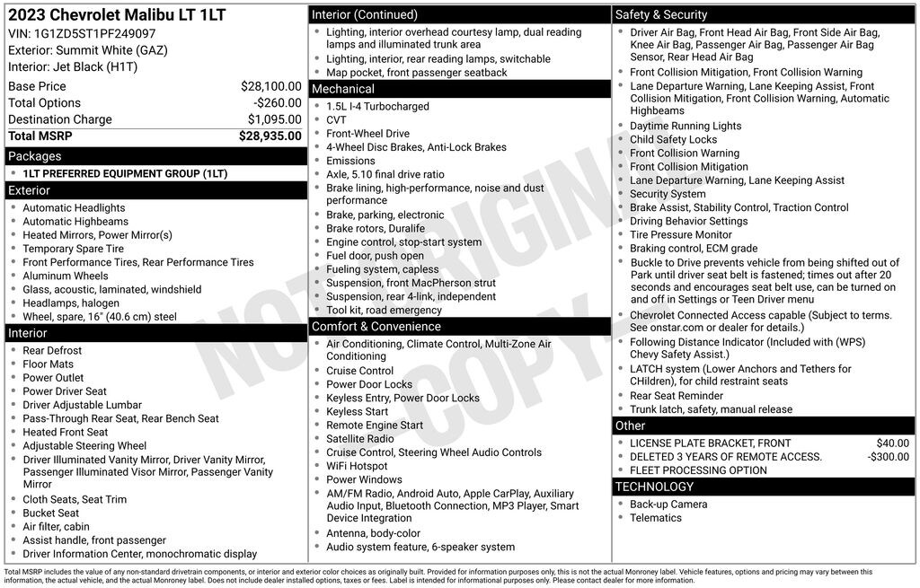 Summit White 2023 Chevrolet Malibu LT 1LT FWD CVT 1.5L DOHC Malibu LT 1LT, 4D Sedan, 1.5L DOHC, FWD, Summit White, Black Cloth.