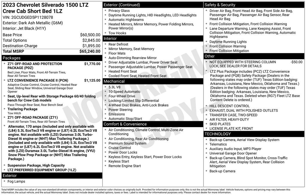 Dark Ash Metallic 2023 Chevrolet Silverado 1500 LTZ 4WD 10-Speed Automatic EcoTec3 5.3L V8 Silverado 1500 LTZ, 4D Crew Cab, EcoTec3 5.3L V8, 10-Speed Automatic, 4WD, Dark Ash Metallic, Jet Black Leather.