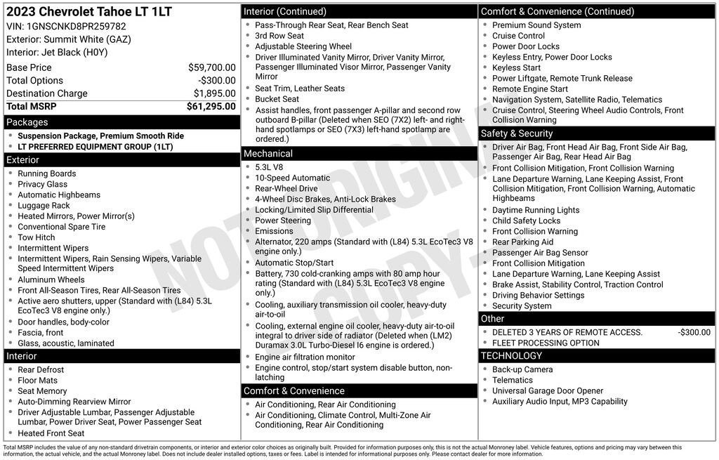 Preferred Equipment Group 1LT (1st & 2nd Row Color-Keyed Carpeted Floor Mats, Auto-Dimming Inside Rear-View Mirror, Bose 9-Speaker Stereo Audio System Feature, Bright Front & Rear Door Sill Plates, Color-Keyed Carpeting Floor Covering, Driver & Front Outboard Passenger Airbags, Enhanced Driver Information Center, Floor Console w/Storage Area, Hands-Free Rear Power Programmable Liftgate, Infotainment Display, LED Daytime Running Lamps, Memory Settings for Driver, Remote Start, SiriusXM Radio w/360L, Universal Home Remote, Wireless Charging, and Wrapped Steering Wheel), Tahoe LT, 4D Sport Utility, EcoTec3 5.3L V8, 10-Speed Automatic with Overdrive, RWD, Summit White, Black Leather, 10-Way Power Driver & Passenger Seat Adjusters, 3.23 Rear Axle Ratio, 3rd row seats: split-bench, 4-Wheel Disc Brakes, 9 Speakers, ABS brakes, Air Conditioning, Alloy wheels, AM/FM radio: SiriusXM with 360L, Apple CarPlay/Android Auto, Auto High-beam Headlights, Auto-dimming Rear-View mirror, Automatic temperature control, Brake assist, Bumpers: body-color, Compass, Delay-off headlights, Deleted 3 Years of Remote Access, Driver door bin, Driver vanity mirror, Dual front impact airbags, Dual front side impact airbags, Electronic Stability Control, Emergency communication system: OnStar and Chevrolet connected services capable, Four wheel independent suspension, Front anti-roll bar, Front Bucket Seats, Front Center Armrest, Front dual zone A/C, Front High-Back Reclining Bucket Seats, Front reading lights, Fully automatic headlights, Garage door transmitter, Heated door mirrors, Heated Driver & Front Passenger Seats, Heated front seats, Illuminated entry, Leather-Appointed Seat Trim, Low tire pressure warning, Memory seat, Navigation System, Occupant sensing airbag, Outside temperature display, Overhead airbag, Overhead console, Panic alarm, Passenger door bin, Passenger vanity mirror, Power door mirrors, Power driver seat, Power Liftgate, Power passenger seat, Power steering, Power windows, Premium audio system: Chevrolet Infotainment 3 Premium, Premium Smooth Ride Suspension, Radio: Chevrolet Infotainment 3 Premium System, Rain sensing wipers, Rear air conditioning, Rear anti-roll bar, Rear reading lights, Rear seat center armrest, Rear window defroster, Rear window wiper, Remote keyless entry, Roof rack: rails only, Security system, Speed control, Speed-sensing steering, Split folding rear seat, Spoiler, Steering wheel mounted audio controls, Tachometer, Telescoping steering wheel, Tilt steering wheel, Traction control, Trip computer, Variably intermittent wipers, Voltmeter, and Wheels: 18" x 8.5" Bright Silver Painted Aluminum.