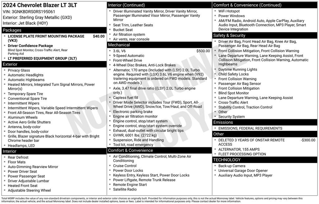Driver Confidence Package (Lane Change Alert w/Side Blind Zone Alert, Rear Cross Traffic Alert, and Rear Park Assist w/Audible Warning), Preferred Equipment Group 3LT (6-Way Power Front Passenger Seat Adjuster, Black Roof-Mounted Side Rails, Inside Rear-View Auto-Dimming Mirror, Outside Heated Power-Adjustable Body-Color Mirrors, Rear Power Programmable Liftgate, and Universal Home Remote), Blazer LT, 4D Sport Utility, 3.6L V6 SIDI, 9-Speed Automatic with Overdrive, FWD, Sterling Gray Metallic, Black Leather, 155 Amp Alternator, 170 Amp Alternator, 4-Wheel Disc Brakes, 6 Speakers, 6-Speaker Audio System Feature, 8-Way Power Driver Seat Adjuster, ABS brakes, Air Conditioning, Alloy wheels, AM/FM radio: SiriusXM with 360L, Apple CarPlay/Android Auto, Auto High-beam Headlights, Auto-dimming door mirrors, Auto-dimming Rear-View mirror, Automatic temperature control, Brake assist, Bumpers: body-color, Child-Seat-Sensing Airbag, Compass, Delay-off headlights, Deleted 3 Years of OnStar Remote Access, Driver door bin, Driver vanity mirror, Dual front impact airbags, Dual front side impact airbags, Electronic Stability Control, Emergency communication system: OnStar and Chevrolet connected services capable, Four wheel independent suspension, Front anti-roll bar, Front Bucket Seats, Front Center Armrest, Front dual zone A/C, Front reading lights, Fully automatic headlights, Garage door transmitter, Heated door mirrors, Heated Driver & Front Passenger Seats, Heated front seats, Illuminated entry, Knee airbag, Leather Shift Knob, Leather steering wheel, Low tire pressure warning, Occupant sensing airbag, Outside temperature display, Overhead airbag, Overhead console, Panic alarm, Passenger door bin, Passenger vanity mirror, Perforated Leather-Appointed Seat Trim, Power door mirrors, Power Driver Lumbar Control, Power driver seat, Power Liftgate, Power passenger seat, Power steering, Power windows, Premium audio system: Chevrolet Infotainment 3 Plus, Radio data system, Radio: Chevrolet Infotainment 3 Plus System, Rear anti-roll bar, Rear reading lights, Rear seat center armrest, Rear window defroster, Rear window wiper, Remote keyless entry, Ride & Handling Suspension, Security system, SiriusXM w/360L, Speed control, Speed-sensing steering, Split folding rear seat, Spoiler, Steering wheel mounted audio controls, Tachometer, Telescoping steering wheel, Tilt steering wheel, Traction control, Trip computer, Turn signal indicator mirrors, Variably intermittent wipers, Voltmeter, and Wheels: 18" Grazen Metallic Aluminum.