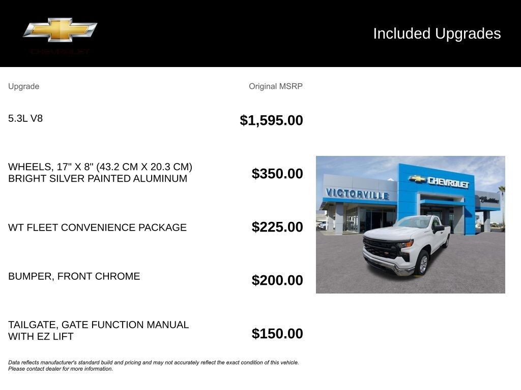 Preferred Equipment Group 1WT (3.5" Monochromatic Display Driver Info Center, Black (Semi-Gloss) Front Bumper, Black (Semi-Gloss) Rear Bumper, Bluetooth® For Phone, Chevrolet Connected Access Capable, Electrical Steering Column Lock, Front Frame-Mounted Black Recovery Hooks, HD Rear Vision Camera, Heated Power-Adjustable Outside Mirrors, Inside Rear-View Mirror w/Tilt, Locking Tailgate, Manual Tailgate Function w/No EZ Lift, Manual Tilt Wheel Steering Column, OnStar & Chevrolet Connected Services Capable, Power Front Windows w/Driver Express Up/Down, Power Front Windows w/Passenger Express Down, Remote Keyless Entry, Rubberized-Vinyl Floor Covering, SiriusXM Delete, Solar Absorbing Tinted Glass, Standard Tailgate, and Wi-Fi Hot Spot Capable), Standard Suspension Package, 10-Speed Automatic, Black Cloth, 170 Amp Alternator, 2 Speakers, 2-Speaker Audio System, 220 Amp Alternator, 4-Wheel Disc Brakes, 40/20/40 Front Split Bench Seat, ABS brakes, Air Conditioning, Auto High-beam Headlights, Automatic Emergency Braking, Auxiliary External Transmission Oil Cooler, Brake assist, Compass, Delay-off headlights, Driver door bin, Dual front impact airbags, Dual front side impact airbags, Electronic Cruise Control, Electronic Stability Control, External Engine Oil Cooler, EZ Lift Power Lock & Release Tailgate, Following Distance Indicator, Forward Collision Alert, Front anti-roll bar, Front Center Armrest w/Storage, Front Chrome Bumper, Front License Plate Kit, Front Pedestrian Braking, Front reading lights, Front wheel independent suspension, Fully automatic headlights, Heated door mirrors, Illuminated entry, IntelliBeam Automatic High Beam On/Off, Lane Keep Assist w/Lane Departure Warning, Low tire pressure warning, Occupant sensing airbag, Outside temperature display, Overhead airbag, Overhead console, Panic alarm, Passenger door bin, Passenger vanity mirror, Power door mirrors, Power steering, Power windows, Premium audio system: Chevrolet Infotainment 3, Radio data system, Radio: Chevrolet Infotainment 3 System, Rear Chrome Bumper, Rear reading lights, Rear step bumper, Remote keyless entry, Speed-sensing steering, Tachometer, Tilt steering wheel, Traction control, Trip computer, Variably intermittent wipers, Vinyl Seat Trim, Voltmeter, Wheels: 17" x 8" Bright Silver Painted Aluminum, and Wheels: 17" x 8" Ultra Silver Painted Steel.