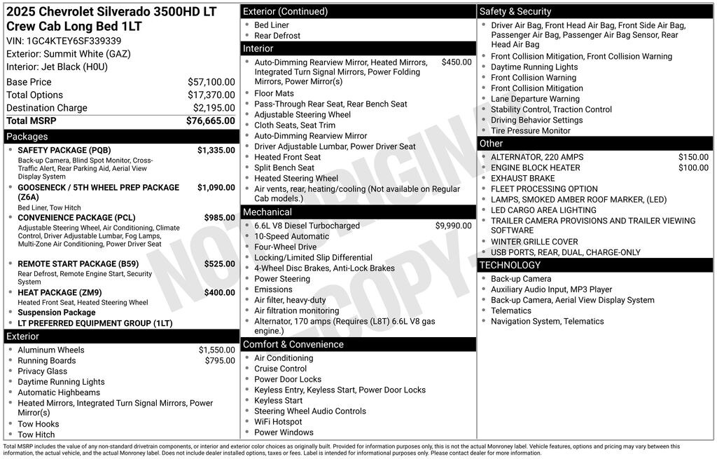 *Price does not include Tax, title, license and dealer fees (unless itemized above).  Not available with special finance or lease offers. Price does not include any dealer added accessories, which may include, but are not limited to: Lojack $1,995, Door Edge Guards $1,495, Battery Protection $995, Windshield Protection $1,495, Lift Kits, Royal Truck Bodies, Running Boards, Floor Liners, Market Adjustments and more. This equipment and any dealer installed accessories can be purchased by the customer at an additional cost listed on the vehicle. Information provided is believed accurate, however all specifications, pricing, and availability must be confirmed with the dealer.All prices, specifications and availability subject to change. Please contact dealer for complete & accurate pricing details. MSRP is shown for information purposes only. MSRP is not the dealer's advertised or asking price. In some instances, vehicles will sell above the MSRP.