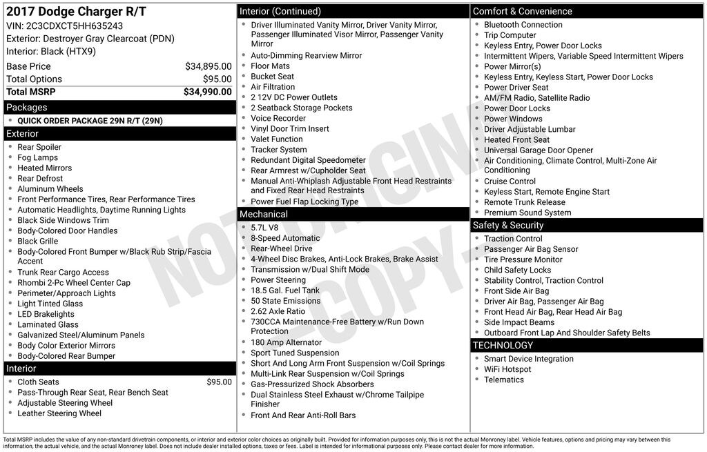 Quick Order Package 29N R/T (R/T Badge and Trailer Sway Damping), Charger R/T, 4D Sedan, HEMI 5.7L V8 Multi Displacement VVT, 8-Speed Automatic, RWD, Destroyer Gray Clearcoat, Black Cloth, 4-Wheel Disc Brakes, 6 Speakers, ABS brakes, Air Conditioning, All Speed Traction Control, Alloy wheels, AM/FM radio: SiriusXM, Anti-whiplash front head restraints, Apple CarPlay/Android Auto, Auto-dimming Rear-View mirror, Automatic temperature control, Body Color Exterior Mirrors, Brake assist, Bumpers: body-color, Compass, Delay-off headlights, Driver door bin, Driver vanity mirror, Dual front impact airbags, Dual front side impact airbags, Electronic Stability Control, Emergency communication system: Uconnect Access, Exterior Mirrors w/Heating Element, Four wheel independent suspension, Front anti-roll bar, Front Bucket Seats, Front Center Armrest, Front dual zone A/C, Front fog lights, Front reading lights, Fully automatic headlights, Garage door transmitter: HomeLink, Heated door mirrors, Heated Front Seats, Heated front seats, Illuminated entry, Leather Shift Knob, Low tire pressure warning, Occupant sensing airbag, Outside temperature display, Overhead airbag, Overhead console, Panic alarm, Passenger door bin, Passenger vanity mirror, Power 4-Way Driver Lumbar Adjust, Power 8-Way Driver Seat, Power door mirrors, Power driver seat, Power steering, Power windows, Radio data system, Radio: Uconnect 4C w/8.4" Display, Rear anti-roll bar, Rear Armrest w/Cupholder Seat, Rear reading lights, Rear seat center armrest, Rear window defroster, Remote keyless entry, Rhombi 2-Pc Wheel Center Cap, Speed control, Speed-Sensitive Wipers, Split folding rear seat, Spoiler, Sport Cloth Seats, Steering wheel mounted audio controls, Tachometer, Telescoping steering wheel, Tilt steering wheel, Traction control, Trip computer, Variably intermittent wipers, and Wheels: 20" x 8.0" Premium Painted Aluminum.