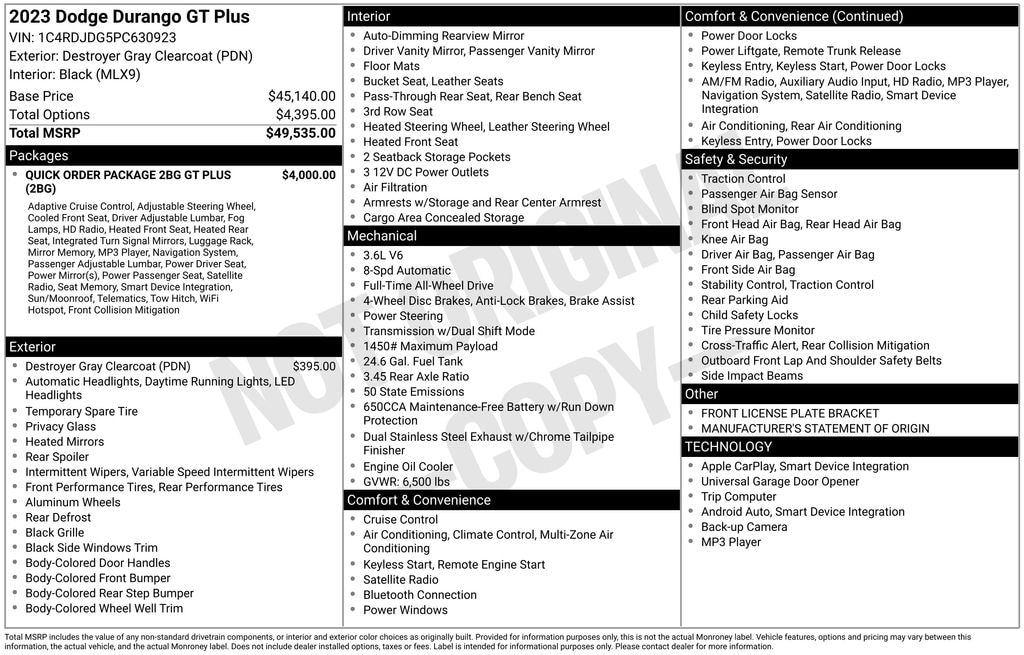 Quick Order Package 2BG GT Plus (1-Year Trial (Registration Required), 10.1" Touchscreen Display, 115V Auxiliary Power Outlet, 180 Amp Alternator, 4G LTE Wi-Fi Hot Spot, 7 & 4 Pin Wiring Harness, Adaptive Cruise Control w/Stop, Apple CarPlay, Auto-Dimming Exterior Driver Mirror, Black Roof Rails, Class IV Receiver Hitch, Connected Travel & Traffic Services, Disassociated Touchscreen Display, Dual Remote USB Port - Charge Only, Exterior Mirrors w/Heating Element, Exterior Mirrors w/Memory, Exterior Mirrors w/Supplemental Signals, Floor Console w/Leather Armrest, Full Speed Forward Collision Warning Plus, Gloss Black Exterior Mirrors, Google Android Auto, GPS Antenna Input, GPS Navigation, HD Radio, Heated Second Row Seats, Heavy-Duty Engine Cooling, Integrated Center Stack Radio, Integrated Roof Rail Crossbars, Integrated Voice Command w/Bluetooth, Leather Trimmed Bucket Seats, Leather Wrapped Door Panels, LED Auxiliary Low Beam & Turn Signal, Power 6x9 Multi-Function Foldaway Mirrors, Power 8-Way Driver Memory 8-Way Passenger Seats, Power Driver/Passenger 4-Way Lumbar Adjust, Power Sunroof, Power Tilt & Telescopic Steering Column, Premium LED Fog Lamps, Radio: Uconnect 5 Nav w/10.1" Display, Radio/Driver Seat/Mirrors Memory, Rear Load Leveling Suspension, Red Accent Stitching, SiriusXM Guardian - Included Trial (B), SiriusXM w/360L, Trailer Brake Control, USB Host Flip, and Ventilated Front Seats), Durango GT Plus, 4D Sport Utility, 3.6L V6 24V VVT, 8-Speed Automatic, AWD, Destroyer Gray Clearcoat, Black Leather, 3.45 Rear Axle Ratio, 3rd row seats: split-bench, 4-Wheel Disc Brakes, 6 Speakers, ABS brakes, Air Conditioning, Alloy wheels, AM/FM radio: SiriusXM, Apple CarPlay/Android Auto, Auto-dimming Rear-View mirror, Automatic temperature control, Brake assist, Bumpers: body-color, Cloth Bucket Seats w/Shift Insert, Compass, Delay-off headlights, Driver door bin, Driver vanity mirror, Dual front impact airbags, Dual front side impact airbags, Electronic Stability Control, Four wheel independent suspension, Front anti-roll bar, Front Bucket Seats, Front Center Armrest w/Storage, Front dual zone A/C, Front License Plate Bracket, Front reading lights, Fully automatic headlights, Garage door transmitter, Heated door mirrors, Heated front seats, Heated steering wheel, Illuminated entry, Knee airbag, Leather steering wheel, Low tire pressure warning, Manufacturer's Statement of Origin, Occupant sensing airbag, Outside temperature display, Overhead airbag, Overhead console, Panic alarm, ParkView Rear Back-Up Camera, Passenger door bin, Passenger vanity mirror, Power door mirrors, Power driver seat, Power Liftgate, Power steering, Power windows, Radio data system, Radio: Uconnect 4 w/8.4" Display, Rear air conditioning, Rear anti-roll bar, Rear reading lights, Rear seat center armrest, Rear window defroster, Rear window wiper, Remote keyless entry, SiriusXM Radio Service, SiriusXM Satellite Radio, Speed control, Speed-sensing steering, Speed-Sensitive Wipers, Split folding rear seat, Spoiler, Sport steering wheel, Steering wheel mounted audio controls, Tachometer, Telescoping steering wheel, Tilt steering wheel, Traction control, Trip computer, Variably intermittent wipers, Voltmeter, and Wheels: 20" x 8.0" Fine Silver.