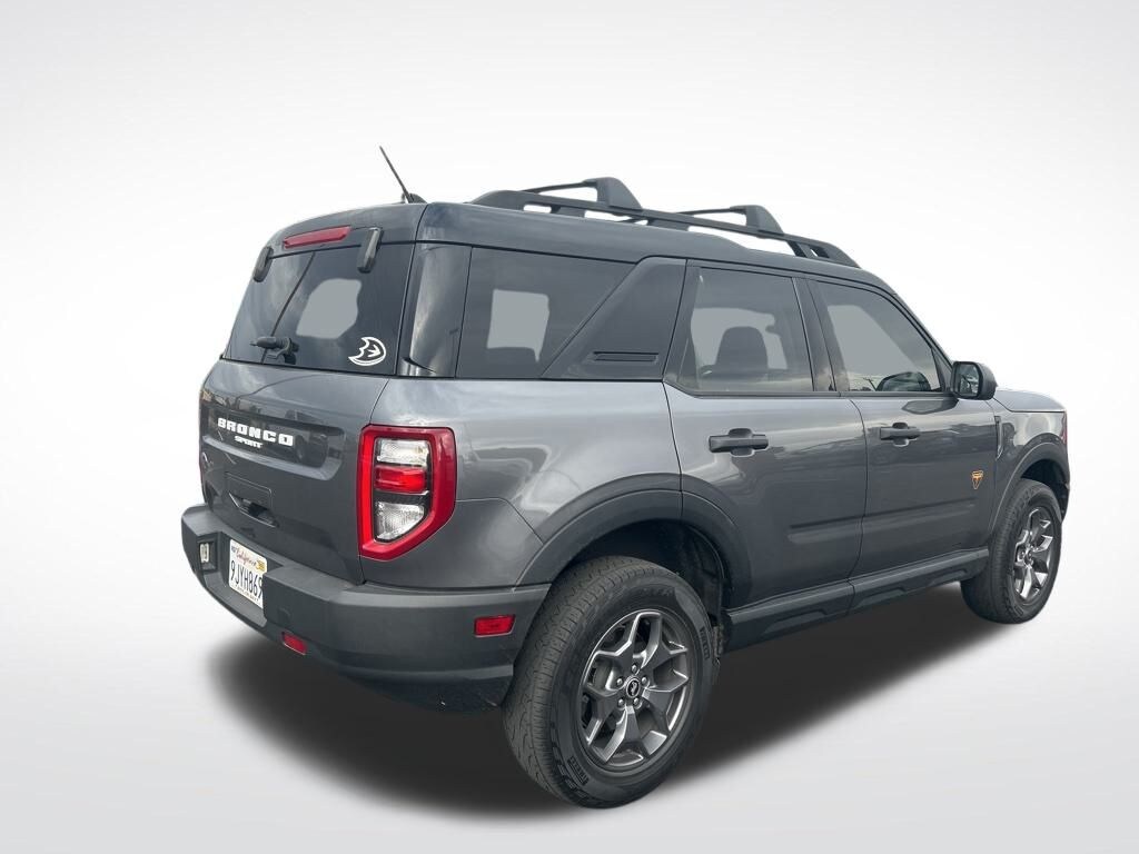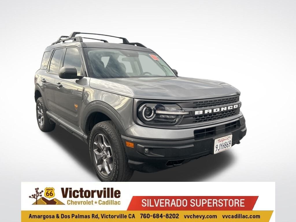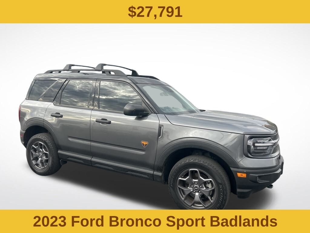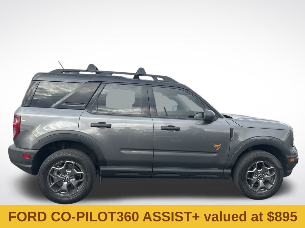 Equipment Group 400A, Ford Co-Pilot360 Assist+ (Evasive Steering Assist, Intelligent Adaptive Cruise Control w/Stop & Go, and Voice-Activated Touchscreen Navigation System), Bronco Sport Badlands, 4D Sport Utility, EcoBoost 2.0L I4 GTDi DOHC Turbocharged VCT, 8-Speed Automatic, 4WD, Carbonized Gray Metallic, Ebony/Active Orange Cloth, 3.80 Axle Ratio, 4-Wheel Disc Brakes, 4G LTE Wi-Fi Hotspot Credit, 6 Speakers, ABS brakes, Air Conditioning, Alloy wheels, AM/FM radio: SiriusXM, AM/FM Stereo, Auto High-beam Headlights, Automatic temperature control, Brake assist, Compass, Delay-off headlights, Driver door bin, Driver vanity mirror, Dual front impact airbags, Dual front side impact airbags, Electronic Stability Control, Emergency communication system: SYNC 3 911 Assist, Four wheel independent suspension, Front anti-roll bar, Front Bucket Seats, Front Center Armrest, Front fog lights, Front License Plate Bracket, Front reading lights, Fully automatic headlights, Heated door mirrors, Heated front seats, Illuminated entry, Knee airbag, Low tire pressure warning, Occupant sensing airbag, Outside temperature display, Overhead airbag, Overhead console, Painted Shadow Black Roof, Panic alarm, Passenger door bin, Passenger vanity mirror, Power door mirrors, Power driver seat, Power steering, Power windows, Radio data system, Rear anti-roll bar, Rear reading lights, Rear seat center armrest, Rear window defroster, Rear window wiper, Remote keyless entry, Security system, SiriusXM, Speed control, Speed-sensing steering, Speed-Sensitive Wipers, Split folding rear seat, Steering wheel mounted audio controls, SYNC 3 Communications & Entertainment System, SYNC 3/Apple CarPlay/Android Auto, Tachometer, Telescoping steering wheel, Tilt steering wheel, Traction control, Trip computer, Unique Style Cloth Htd Sport Contour Bucket Seats, Variably intermittent wipers, and Wheels: 17" Carbonized Gray-Painted Aluminum.