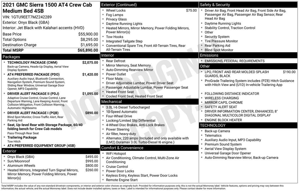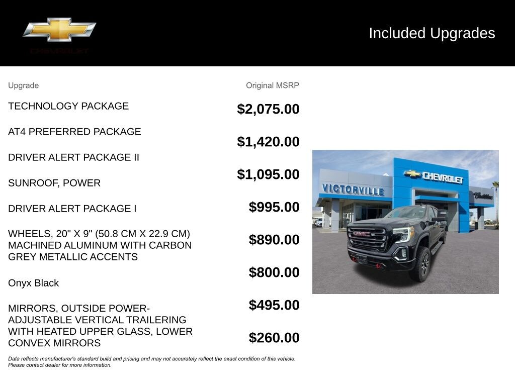 AT4 Preferred Package (Power Sliding Rear Window w/Rear Defogger, Premium Bose 7-Speaker Sound System, Radio: Premium GMC Infotainment Sys w/Navigation, SiriusXM w/360L, Universal Home Remote, and Wireless Charging), Driver Alert Package I (Lane Change Alert w/Side Blind Zone Alert, Perimeter Lighting, Rear Cross Traffic Alert, and Ultrasonic Front & Rear Park Assist), Driver Alert Package II (Adaptive Cruise Control, Automatic Emergency Braking, Following Distance Indicator, Forward Collision Alert, Front Pedestrian Braking, IntelliBeam Automatic High Beam On/Off, Lane Keep Assist w/Lane Departure Warning, and Safety Alert Seat), Preferred Equipment Group 4SB (12-Volt Rear Auxiliary Power Outlet, 120-Volt Bed Mounted Power Outlet, 120-Volt Instrument Panel Power Outlet, 2 USB Ports, 2 USB Ports (1st Row), 4.2" Diagonal Color Display Driver Info Center, 4G LTE Wi-Fi Hotspot Capable, Auto-Locking Rear Differential, Auxiliary External Transmission Oil Cooler, Body-Color Surround Grille, Color-Keyed Carpeting Floor Covering, Compass, Deep-Tinted Glass, Electric Rear-Window Defogger, Electrical Lock Control Steering Column, Floor-Mounted Center Console, Front Prem Floor Liners w/Removable Carpet Insert, GMC Connected Access Capable, HD Rear Vision Camera, Heated Driver & Front Outboard Passenger Seating, Heavy-Duty Air Filter, Hill Descent Control, Hitch Guidance w/Hitch View, In-Vehicle Trailering App, Integrated Trailer Brake Controller, Keyless Open & Start, LED Cargo Area Lighting, Manual Tilt-Wheel & Telescoping Steering Column, OnStar & GMC Connected Services Capable, Power Door Locks, Power Front Passenger Windows w/Express Up/Down, Power Front Windows w/Driver Express Up/Down, Power Rear Windows w/Express Down, ProGrade Trailering System, Rear Dual USB Charging-Only Ports, Rear Prem Floor Liners w/Removable Carpet Insert, Rear Wheelhouse Liners, Red Recovery Hooks, Remote Vehicle Starter System, Spray-On Pickup Bed Liner w/AT4 Logo, Steering Wheel Audio Controls, Theft Deterrent System (Unauthorized Entry), and Ventilated Driver & Front Passenger Seats), Technology Package (8" Driver Information Center, Bed View Camera, HD Surround Vision w/2 Trailer View Camera Provisions, Multicolor 15" Diagonal Head-Up Display, and Rear Camera Mirror), Trailering Package (Hitch Guidance), Sierra 1500 AT4, 4D Crew Cab, 3.0L I6, 10-Speed Automatic, 4WD, Onyx Black, Jet Black With Kalahari Accents Leather, 10-Way Power Driver Seat Adjuster w/Lumbar, 10-Way Power Passenger Seat Adjuster w/Lumbar, 170 Amp Alternator, 18" x 8.5" Machined Aluminum Wheels, 220 Amp Alternator, 3.23 Rear Axle Ratio, 4-Wheel Disc Brakes, 6 Speakers, 6-Speaker Audio System Feature, ABS brakes, Air Conditioning, Alloy wheels, AM/FM radio: SiriusXM with 360L, Apple CarPlay/Android Auto, Auto-dimming door mirrors, Auto-dimming Rear-View mirror, Automatic temperature control, Brake assist, Bumpers: body-color, Chrome Mirror Caps, Delay-off headlights, Driver door bin, Driver Memory, Driver vanity mirror, Dual front impact airbags, Dual front side impact airbags, Electronic Stability Control, Engine Block Heater, Front & Rear Black Molded Splash Guards (LPO), Front anti-roll bar, Front Bucket Seats, Front Center Armrest, Front dual zone A/C, Front fog lights, Front reading lights, Front wheel independent suspension, Fully automatic headlights, Heated 2nd Row Outboard Seats, Heated door mirrors, Heated front seats, Heated steering wheel, Illuminated entry, Low tire pressure warning, Memory seat, Occupant sensing airbag, Off-Road Suspension, Outside temperature display, Overhead airbag, Overhead console, Panic