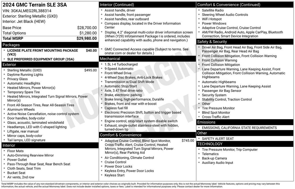GMC Pro Safety Plus (Adaptive Cruise Control, Lane Change Alert w/Side Blind Zone Alert, Outside Heated Power-Adjustable Mirrors, Rear Cross-Traffic Alert, Rear Park Assist, and Safety Alert Seat), License Plate Front Mounting Package, Preferred Equipment Group 3SA, Terrain SLE, 4D Sport Utility, 1.5L DOHC, 9-Speed Automatic, FWD, Sterling Metallic, Jet Black Cloth, 2 USB Data Ports w/Auxiliary Input Jack, 3.47 Final Drive Axle Ratio, 4-Way Manual Driver's Seat, 4-Way Manual Front Passenger Seat, 4-Wheel Disc Brakes, 4.2" Multi-Color Driver Information Screen, 6 Speakers, 6-Speaker Audio System Feature, ABS brakes, Air Conditioning, Alloy wheels, AM/FM radio: SiriusXM, Auto High-beam Headlights, Auto-dimming Rear-View mirror, Automatic temperature control, Bluetooth® For Phone, Brake assist, Bumpers: body-color, Compass, Delay-off headlights, Driver door bin, Driver vanity mirror, Dual front impact airbags, Dual front side impact airbags, Electronic Stability Control, Emergency communication system: OnStar and GMC connected services capable, Four wheel independent suspension, Front anti-roll bar, Front Bucket Seats, Front Center Armrest, Front reading lights, Fully automatic headlights, Heated door mirrors, Illuminated entry, Low tire pressure warning, Occupant sensing airbag, Outside temperature display, Overhead airbag, Overhead console, Panic alarm, Passenger door bin, Passenger vanity mirror, Power door mirrors, Power steering, Power windows, Premium Cloth Seat Trim, Radio data system, Radio: GMC Infotainment Audio System w/7" Display, Rear anti-roll bar, Rear seat center armrest, Rear window defroster, Rear window wiper, Remote keyless entry, Security system, SiriusXM, Speed control, Speed-sensing steering, Split folding rear seat, Spoiler, Steering wheel mounted audio controls, Tachometer, Telescoping steering wheel, Tilt steering wheel, Traction control, Trip computer, Variably intermittent wipers, Wheels: 17" x 7" Silver Painted Aluminum, and Wireless Apple CarPlay/Wireless Android Auto.
