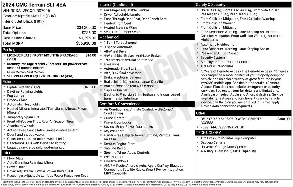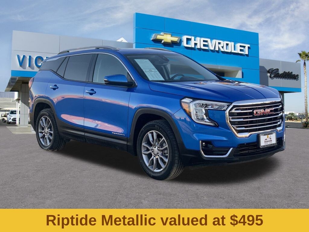 License Plate Front Mounting Package, Preferred Equipment Group 4SA, Terrain SLT, 4D Sport Utility, 1.5L DOHC, 9-Speed Automatic, AWD, Riptide Metallic, Black Leather, 2 USB Data Ports, 2 USB Data Ports w/SD Card Reader, 3.47 Final Drive Axle Ratio, 4-Wheel Disc Brakes, 6 Speakers, 6-Speaker Audio System Feature, 6-Way Power Front Passenger Seat, 8-Way Power Driver Seat Adjuster, ABS brakes, Air Conditioning, Alloy wheels, AM/FM radio: SiriusXM, Auto High-beam Headlights, Auto-dimming Rear-View mirror, Automatic temperature control, Bluetooth® For Phone, Brake assist, Bumpers: body-color, Compass, Delay-off headlights, Deleted 3 Years of Remote Access, Driver & Front Passenger Heated Seats, Driver door bin, Driver vanity mirror, Dual front impact airbags, Dual front side impact airbags, Electronic Stability Control, Emergency communication system: OnStar and GMC connected services capable, Four wheel independent suspension, Front anti-roll bar, Front Bucket Seats, Front Center Armrest, Front dual zone A/C, Front fog lights, Front Passenger 2-Way Power Lumbar, Front reading lights, Fully automatic headlights, Garage door transmitter, Heated door mirrors, Heated front seats, Heated steering wheel, Illuminated entry, Low tire pressure warning, Memory seat, Occupant sensing airbag, Outside temperature display, Overhead airbag, Overhead console, Panic alarm, Passenger door bin, Passenger vanity mirror, Perforated Leather-Appointed Seat Trim, Power door mirrors, Power Driver Lumbar Control, Power driver seat, Power Liftgate, Power passenger seat, Power steering, Power windows, Radio data system, Radio: GMC Infotainment Audio System w/8" Display, Rear anti-roll bar, Rear seat center armrest, Rear window defroster, Rear window wiper, Remote keyless entry, Roof rack: rails only, Security system, SiriusXM, Speed control, Speed-sensing steering, Split folding rear seat, Spoiler, Steering wheel mounted audio controls, Tachometer, Telescoping steering wheel, Tilt steering wheel, Traction control, Trip computer, Turn signal indicator mirrors, Variably intermittent wipers, Wheels: 18" x 7" Silver Painted Aluminum, and Wireless Apple CarPlay/Wireless Android Auto.