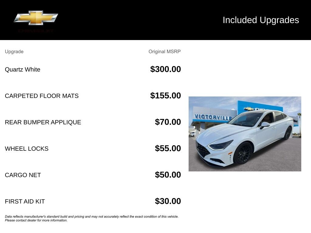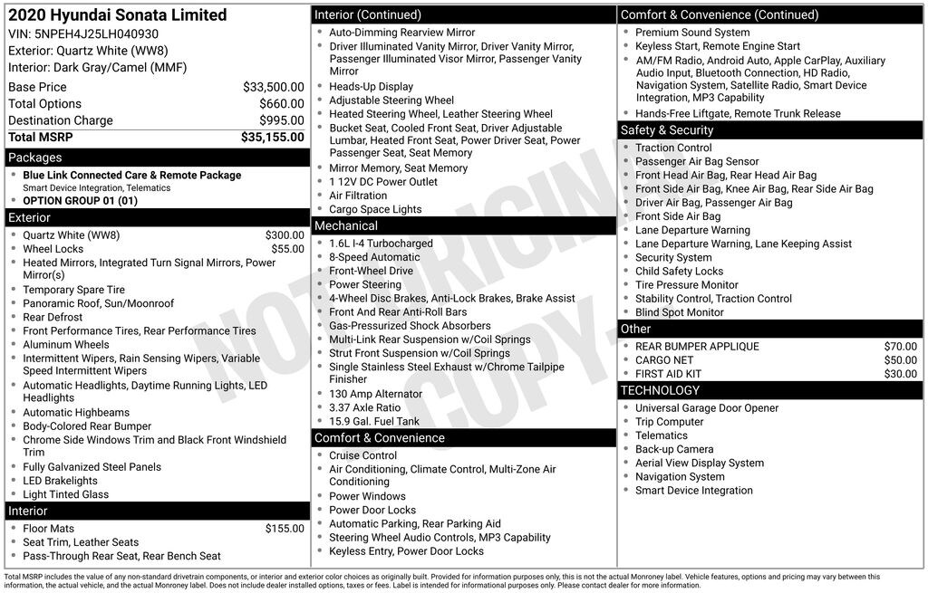 Blue Link Connected Care & Remote Package, Option Group 01, Sonata Limited, 4D Sedan, 1.6L I4, 8-Speed Automatic with Overdrive, FWD, Quartz White, Dark Gray/Camel Leather, 12 Speakers, 4-Wheel Disc Brakes, ABS brakes, Air Conditioning, Alloy wheels, AM/FM radio: SiriusXM, Apple CarPlay & Android Auto, Auto High-beam Headlights, Auto-dimming Rear-View mirror, Automatic temperature control, Bose Premium Audio, Brake assist, Bumpers: body-color, Cargo Net, Carpeted Floor Mats, Delay-off headlights, Driver door bin, Driver vanity mirror, Dual front impact airbags, Dual front side impact airbags, Electronic Stability Control, Emergency communication system: Blue Link Connected Care (3-year subscription), First Aid Kit, Four wheel independent suspension, Front anti-roll bar, Front Bucket Seats, Front Center Armrest, Front dual zone A/C, Front reading lights, Fully automatic headlights, Garage door transmitter: HomeLink, Heads-Up Display, Heated door mirrors, Heated front seats, Heated steering wheel, Heated/Ventilated Front Bucket Seats, Illuminated entry, Knee airbag, Leather Seating Surfaces, Low tire pressure warning, Memory seat, Navigation System, Occupant sensing airbag, Outside temperature display, Overhead airbag, Overhead console, Panic alarm, Passenger door bin, Passenger vanity mirror, Power door mirrors, Power driver seat, Power moonroof, Power passenger seat, Power steering, Power windows, Radio data system, Radio: AM/FM/MP3/HD/SiriusXM Display Audio w/Nav, Rain sensing wipers, Rear anti-roll bar, Rear Bumper Applique, Rear seat center armrest, Rear side impact airbag, Rear window defroster, Remote keyless entry, Security system, Speed control, Speed-sensing steering, Speed-Sensitive Wipers, Split folding rear seat, Steering wheel mounted audio controls, Tachometer, Telescoping steering wheel, Tilt steering wheel, Traction control, Trip computer, Turn signal indicator mirrors, Variably intermittent wipers, Ventilated front seats, Wheel Locks, Wheels: 18 x 7.5J Machine/Argent Finish Alum Alloy, and Wireless Phone Charging.
