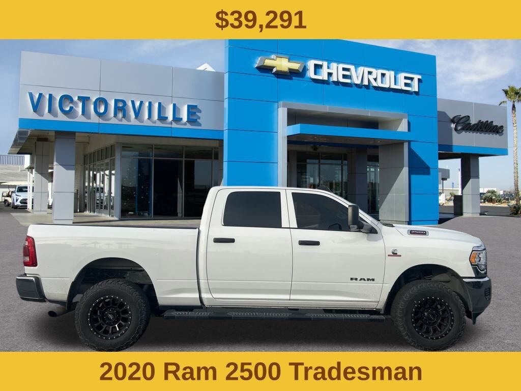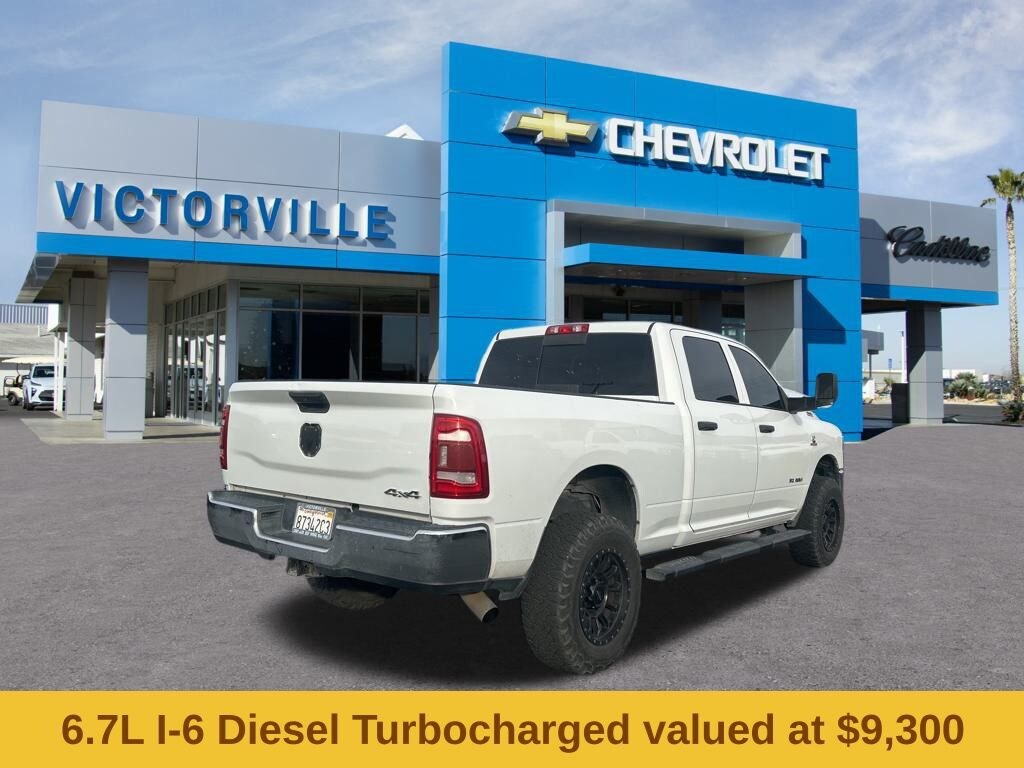 Chrome Appearance Group (Bright Front Bumper, Bright Rear Bumper, Chrome Grille Surround, Matte Black Mesh Grille w/Chrome, and Wheels: 18" x 8.0" Steel Chrome Clad), Protection Group (Tow Hooks), Quick Order Package 2HA Tradesman, Tradesman Level 2 Equipment Group (2 Way Rear Headrest Seat, 4 Way Front Headrests, 40/20/40 Split Bench Seat, Carpet Floor Covering, Cloth 40/20/40 Bench Seat, For More Info, Call 800-643-2112, Front Armrest w/Cupholders, Manual Adjust 4-Way Driver Seat, Manual Adjust 4-Way Front Passenger Seat, Rear Folding Seat, Rear Power Sliding Window, Rear Window Defroster, SiriusXM Radio Service, and SiriusXM Satellite Radio), 2500 Tradesman, 4D Crew Cab, Cummins 6.7L I6 Turbodiesel, 6-Speed Automatic, 4WD, Bright White Clearcoat, Black Cloth, 17" x 7.5" Steel Styled Wheels, 3.73 Axle Ratio, 4-Wheel Disc Brakes, 5th Wheel/Gooseneck Towing Prep Group, 6 Speakers, 8.4" Touchscreen Display, ABS brakes, Active Noise Control System, Air Conditioning, AM/FM radio, Anti-Spin Differential Rear Axle, Apple CarPlay, Black Exterior Mirrors, Blind Spot & Cross Path Detection, Brake assist, Center Hub, Compass, Delay-off headlights, Driver door bin, Dual front impact airbags, Dual front side impact airbags, Electronic Stability Control, Electronically Controlled Throttle, Exterior Mirrors Courtesy Lamps, Exterior Mirrors w/Heating Element, Exterior Mirrors w/Supplemental Signals, Front anti-roll bar, Front Center Armrest w/Storage, Front reading lights, Fully automatic headlights, Google Android Auto, GPS Antenna Input, Heated door mirrors, Heavy Duty Vinyl 40/20/40 Split Bench Seat, Illuminated entry, Integrated Center Stack Radio, Integrated Voice Command w/Bluetooth, LED Tail Lamps, Low tire pressure warning, Manufacturer's Statement of Origin, Mirror Running Lights, Occupant sensing airbag, Outside temperature display, Overhead airbag, Overhead console, ParkView Rear Back-Up Camera, Passenger door bin, Passenger vanity mirror, Power Adjust/Fold & Heated Black Tow Mirrors, Power door mirrors, Power Folding Mirrors, Power steering, Power windows, Radio data system, Radio: Uconnect 3 w/5" Display, Radio: Uconnect 4 w/8.4" Display, Rear anti-roll bar, Rear step bumper, Speed control, Tachometer, Tilt steering wheel, Tip Start, Traction control, Trailer Brake Control, Trailer Tow Mirrors, USB Host Flip, Variably intermittent wipers, Vendor Painted Cargo Box Tracking, and Voltmeter.