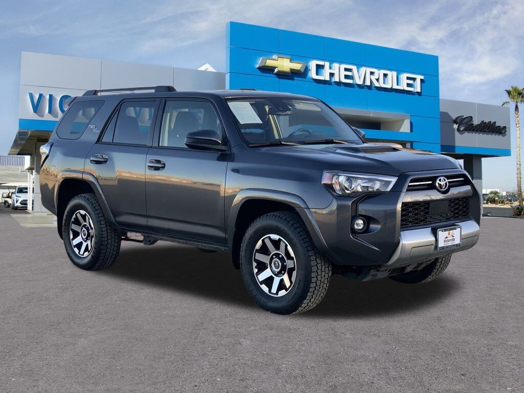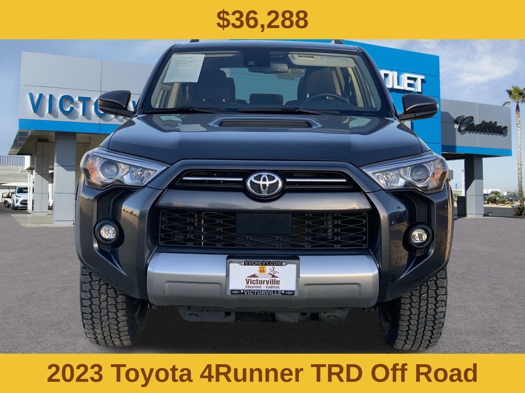 4Runner TRD Off-Road, 4D Sport Utility, 4.0L V6 DOHC 24V, 5-Speed with ECT, 4WD, Magnetic Gray Metallic, Black/Graphite Cloth, 3.727 Axle Ratio, 4-Wheel Disc Brakes, 8 Speakers, ABS brakes, Air Conditioning, Alloy wheels, AM/FM radio: SiriusXM, Anti-whiplash front head restraints, Apple CarPlay/Android Auto, Auto High-beam Headlights, Black Roof Rails, Brake assist, Bumpers: body-color, Compass, Driver door bin, Driver vanity mirror, Dual front impact airbags, Dual front side impact airbags, Electronic Stability Control, Emergency communication system: Safety Connect (1-year trial), Exterior Parking Camera Rear, Fabric Seat Trim, Front anti-roll bar, Front Bucket Seats, Front Center Armrest, Front fog lights, Front reading lights, Front wheel independent suspension, Heated door mirrors, Illuminated entry, Knee airbag, Leather Shift Knob, Low tire pressure warning, Occupant sensing airbag, Outside temperature display, Overhead airbag, Overhead console, Panic alarm, Passenger door bin, Passenger vanity mirror, Power door mirrors, Power driver seat, Power steering, Power windows, Radio: Audio Plus, Rear anti-roll bar, Rear seat center armrest, Rear window defroster, Rear window wiper, Remote keyless entry, Security system, Speed control, Speed-sensing steering, Split folding rear seat, Spoiler, Steering wheel mounted audio controls, Tachometer, Telescoping steering wheel, Tilt steering wheel, Traction control, Trip computer, Variably intermittent wipers, and Wheels: 17" Unique 7-Spoke Off-Road Alloy.