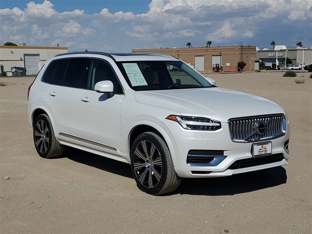 XC90 Recharge Plug-In Hybrid T8 Core Bright Theme, 4D Sport Utility, 2.0L I4 Hybrid Turbocharged DOHC 16V LEV3-SULEV30, Automatic with Geartronic, AWD, Blonde Leather, 10 Speakers, 3rd row seats: bucket, 4-Wheel Disc Brakes, ABS brakes, Air Conditioning, Alloy wheels, AM/FM radio: SiriusXM, Anti-whiplash front head restraints, Apple CarPlay, Auto High-beam Headlights, Auto-dimming door mirrors, Auto-dimming Rear-View mirror, Automatic temperature control, Brake assist, Bumpers: body-color, Delay-off headlights, Driver door bin, Driver vanity mirror, Dual front impact airbags, Dual front side impact airbags, Electronic Stability Control, Emergency communication system: Volvo Cars App w/4 Year Subscription, Exterior Parking Camera Rear, Four wheel independent suspension, Front anti-roll bar, Front Bucket Seats, Front Center Armrest w/Storage, Front dual zone A/C, Front reading lights, Fully automatic headlights, Garage door transmitter: HomeLink, Genuine wood dashboard insert, Genuine wood door panel insert, Heated door mirrors, Heated Front Bucket Seats, Heated front seats, Illuminated entry, Knee airbag, Leather Upholstery, Low tire pressure warning, Memory seat, Navigation System, Occupant sensing airbag, Outside temperature display, Overhead airbag, Panic alarm, Passenger door bin, Passenger vanity mirror, Power door mirrors, Power driver seat, Power Liftgate, Power moonroof, Power passenger seat, Power steering, Power windows, Radio data system, Radio: High Performance Audio System, Rain sensing wipers, Rear air conditioning, Rear anti-roll bar, Rear dual zone A/C, Rear fog lights, Rear reading lights, Rear seat center armrest, Rear window defroster, Rear window wiper, Remote keyless entry, Security system, Speed control, Speed-sensing steering, Split folding rear seat, Spoiler, Steering wheel mounted audio controls, Tachometer, Telescoping steering wheel, Traction control, Trip computer, Turn signal indicator mirrors, Variably intermittent wipers, and Wheels: 20" 5-Multi Spoke Black Diamond Cut Alloy.
